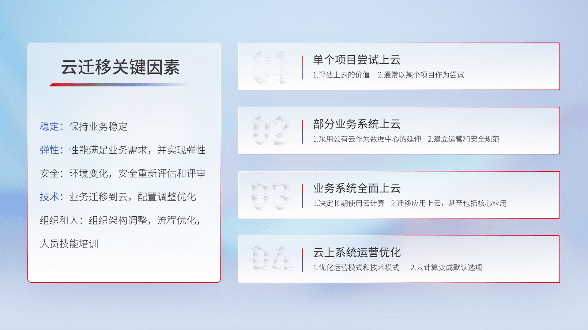 结合实际业务,,,,从规划设计、、、云平台选型、、云原生改造、、数据迁移、、、集成交付,,,迁移全过程为客户识别最佳上云路径,,,做好风险识别管理,,设计网络架构、、、身份权限、、、、安全审计合规、、、、操作审计、、日志审计、、、监控告警策略、、多站点容灾设计等,,,,对云上基础设施进行整体规划,,提升IT治理水平,,,以满足弹性、、、高可用、、、高性能的需求。。。