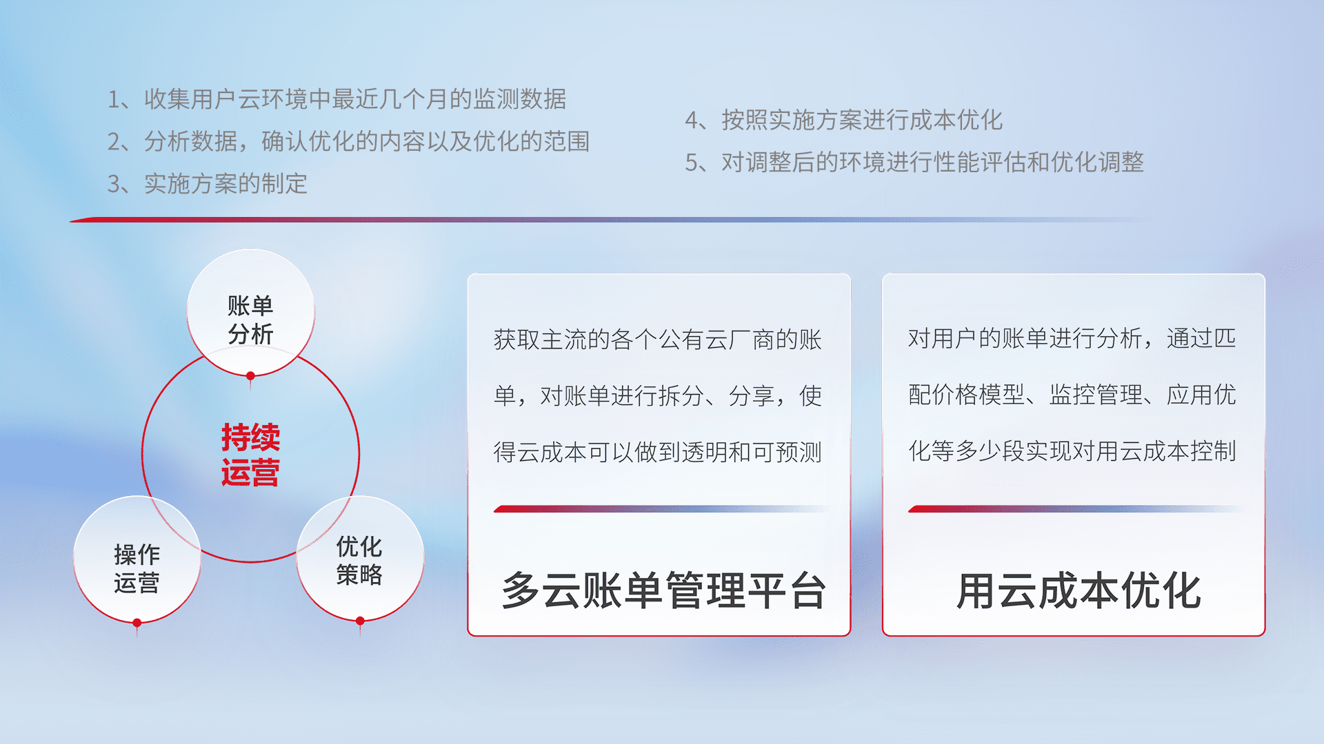 通过多云纳管,,,以统一的资源数据模型把客户的云资源进行抽象和封装,,进而实现对多云资源的统一操作,,保障云资源管理的可靠性、、、稳定性与可用性。。量身定制化运维内容,,配置、、、、开发运维、、补丁管理、、、、备份、、、监控、、、认证和访问管理、、、、审计和日常巡检等,,,保障在用云过程中的可靠度,,,稳定度以及高可用率。。